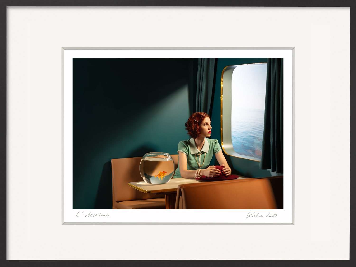 Mit L’Accalmie gelingt Horst Kistner eine faszinierende Verbindung von kühler Eleganz und emotionaler Tiefe. Die Fotografie zeigt eine Frau, die – in sich ruhend – am Fenster eines Schiffs steht. Durch das Fenster fällt das weiche Licht des Meeres, das den Raum in eine Atmosphäre stiller Erwartung taucht. Der Moment scheint eingefroren zwischen Aufbruch und Ankunft – zwischen Sehnsucht und Erinnerung.