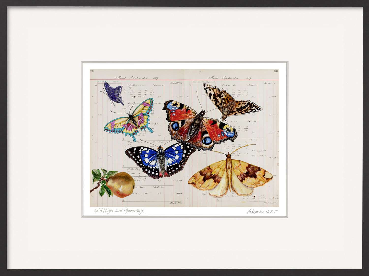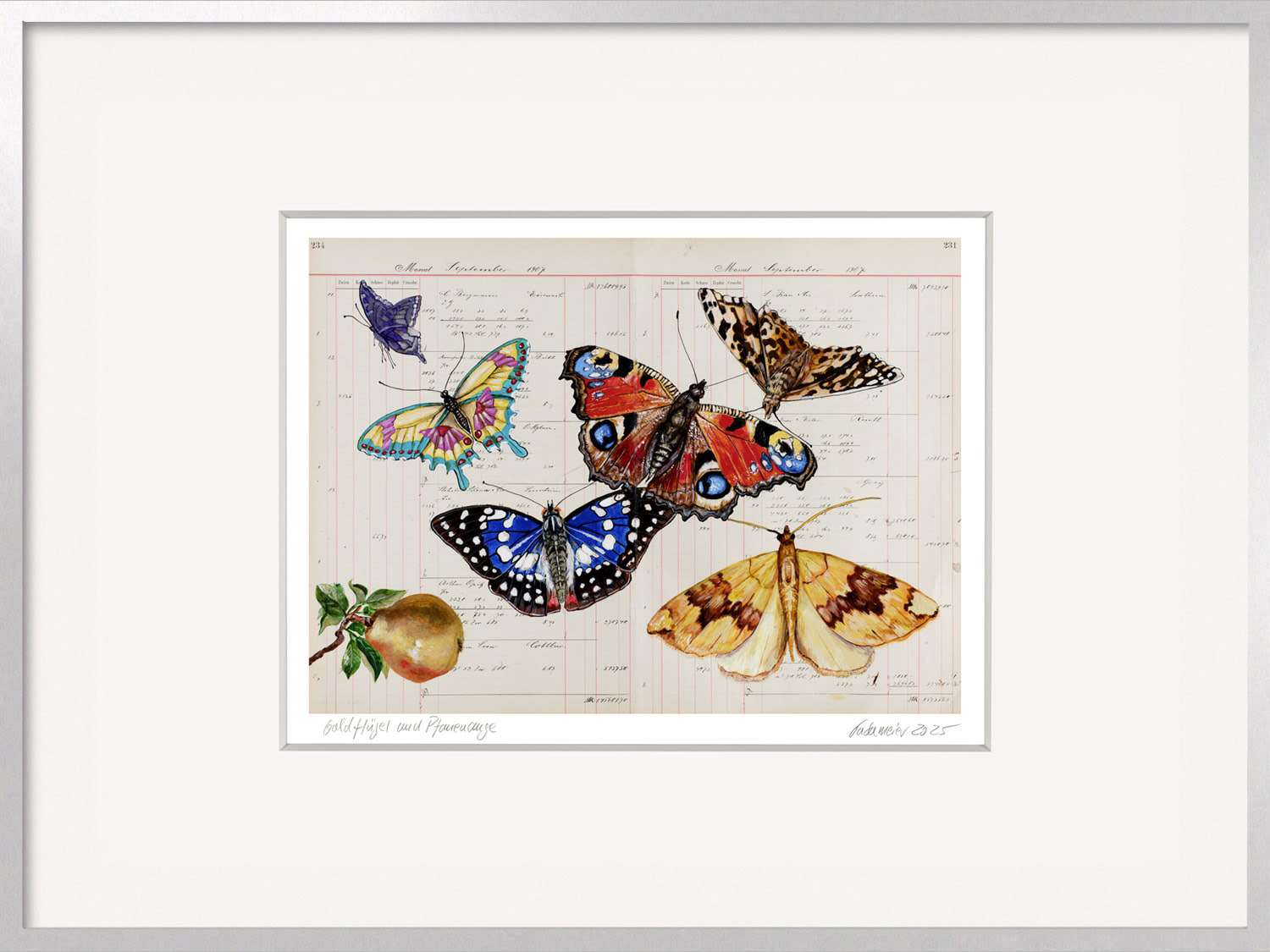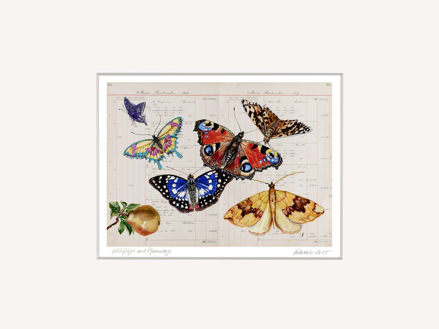 Die zarten Schmetterlinge entfalten ihre Flügel über antikem Kontopapier, das mit seiner Patina einen feinen Kontrast zu den leuchtenden Farben bildet. Gold und Blau, Rot und Gelb – sie vereinen sich zu einem poetischen Bild der Lebenslust.