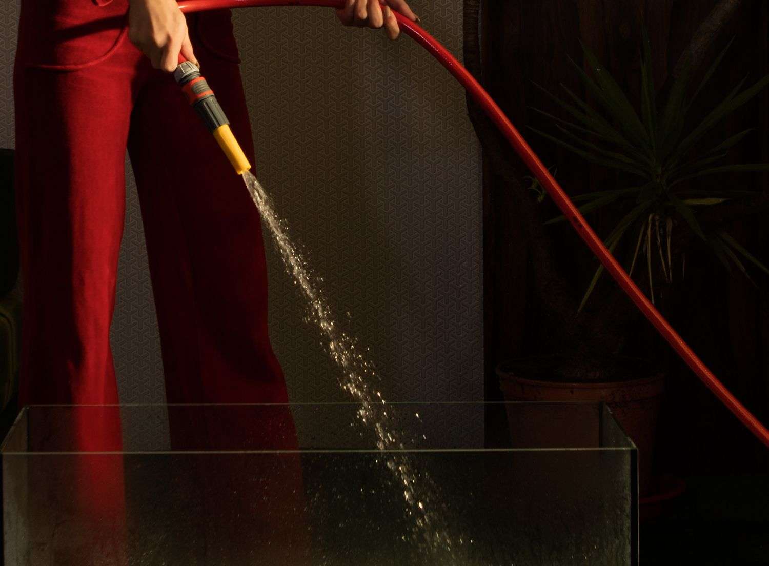 Sie trägt einen leuchtend roten Hausanzug, vor ihr steht ein durchsichtiges Becken, das sich langsam mit Wasser füllt. Der Schlauch in ihrer Hand wird zum Werkzeug einer stillen Inszenierung.