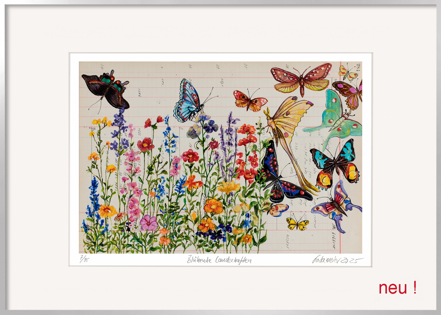 Blühende Landschaften ist ein fröhliches Naturbild, das Bewegung und Leichtigkeit ausstrahlt. Die Blumen wachsen locker nach oben, die Falter scheinen im Moment des Flugs eingefangen. Alles wirkt lebendig, klar und zugleich harmonisch.