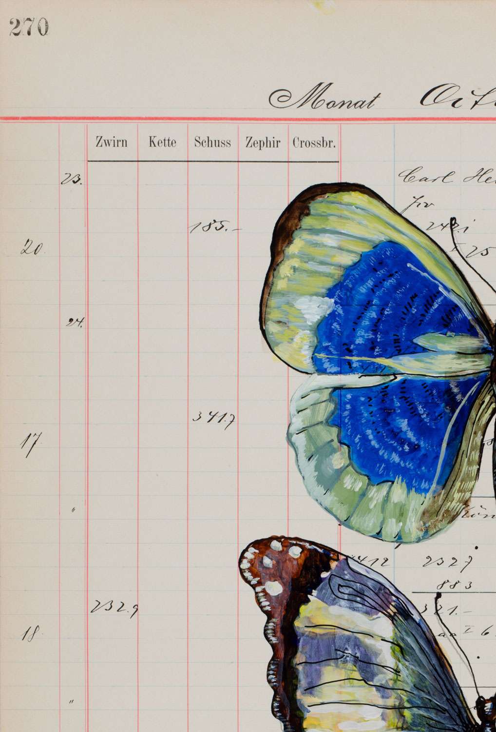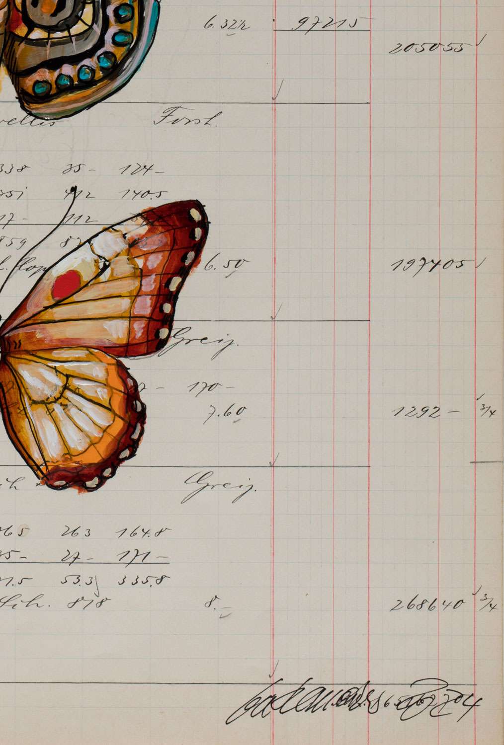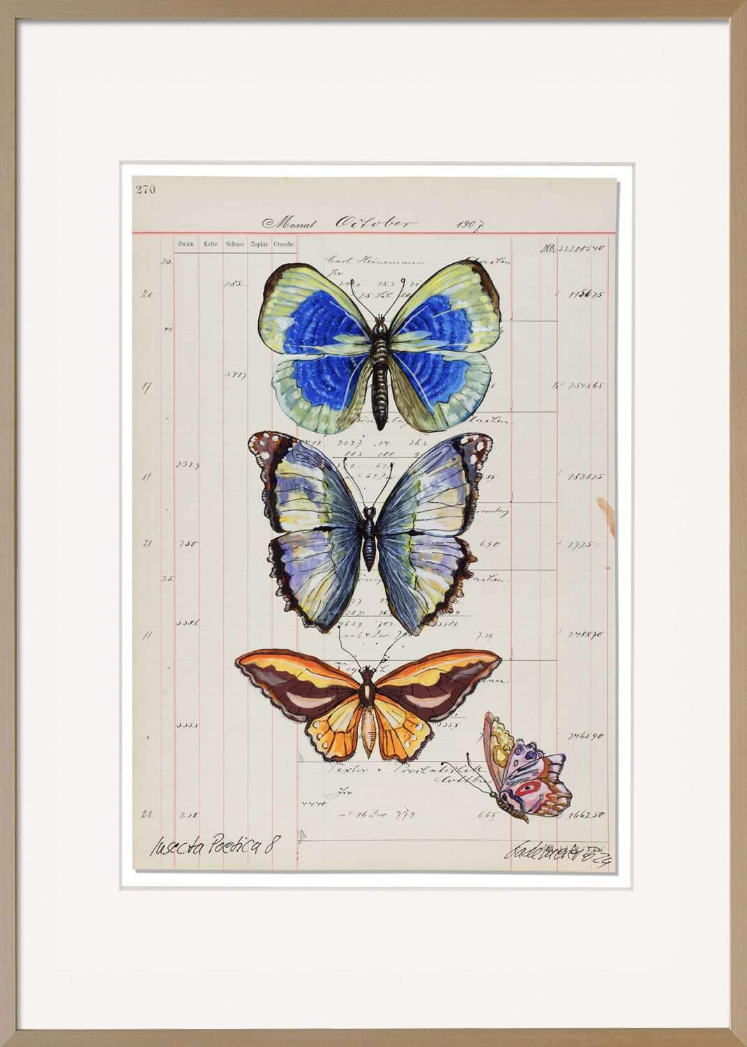 Das Unikat Insecta Poetica 8 vereint die filigrane Schönheit farbenprächtiger Schmetterlinge mit der historischen Aura alter Kontoblätter. Thomas Gatzemeier setzt in dieser Werkreihe auf eine faszinierende Verbindung von Naturdarstellung und Geschichte: Fein ausgearbeitete Insektenmotive werden auf originalen Buchhaltungsseiten aus dem frühen 20. Jahrhundert inszeniert.